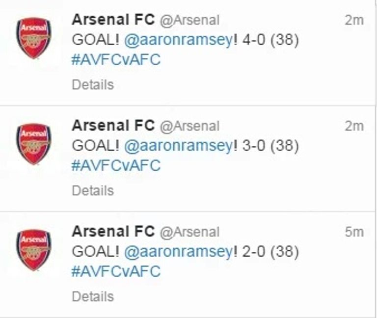 يبدو أن احتفال نادي أرسنال بهدف لاعبه الويلزي آرون رامسي في مرمى أستون فيلاً قد دفعه لارتكاب خطأ عبر حسابه الرسمي على موقع التواصل الاجتماعي تويتر.