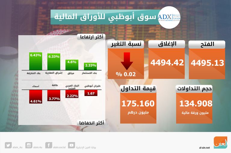 بدد مؤشر "أبوظبي" المالي مكاسبه الصباحية ليغلق متماسكًا عند 4494.42 نقطة فاقدًا 0.02%، في جلسة غلب تذبذب المؤشر بين الصعود والهبوط، وشهدت الجلسة عودة نشاط معدلات السيولة، حيث تم التداول على 134.908 مليون ورقة مالية حققت سيولة 175.160 مليون درهم إماراتي تم تنفيذها خلال 1.598 ألف صفقة.
