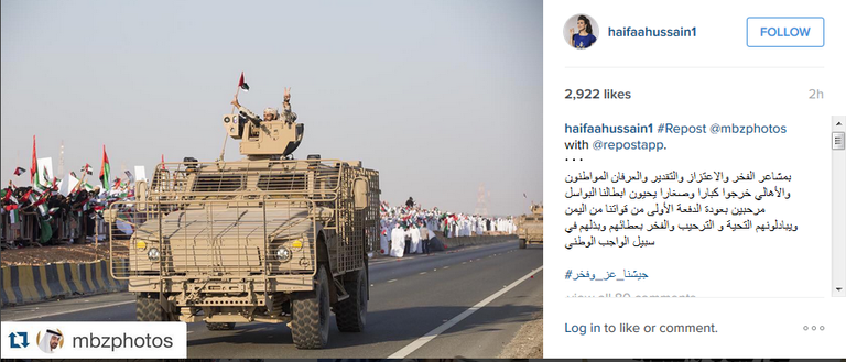 وأظهر الممثل الإماراتي حبيب غلوم، اهتماما بهذا الحدث، ظهر واضحا على صفحته بموقع "إنستغرام"، والتي غمرتها صور التعبير عن الفرحة بعودة الجنود، مصحوبة بتعليقاتٍ وجّه فيها الشكر لهم، والدعاء لجنود الإمارات والخليج بالنصر.