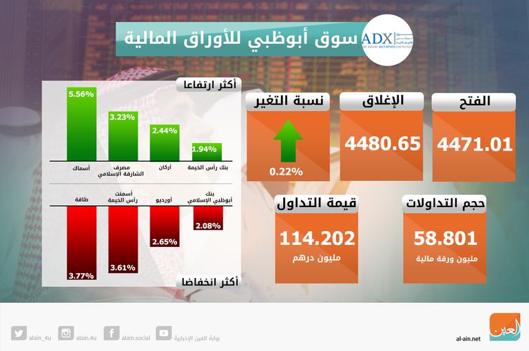وارتفع المؤشر العام لسوق "أبوظبي" المالي 0.22% ليغلق عند 4480.65 نقطة، بعد التداول على 58.801 كليون ورقة مالية بإجمالي قيمة تداولات 114.202 مليون درهم.