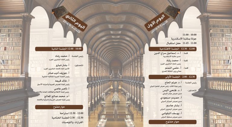 ينظم اتحاد الناشرين العرب برئاسة الناشر محمد رشاد مؤتمر مديري معارض الكتب العربية تحت شعار "التحديات والمستقبل" في مكتبة الإسكندرية.