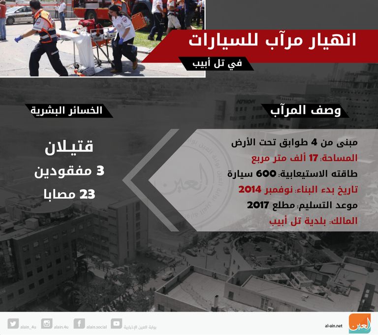 إنفوجراف.. قتيلان و23 مصابا بانهيار مرآب للسيارات في تل أبيب
