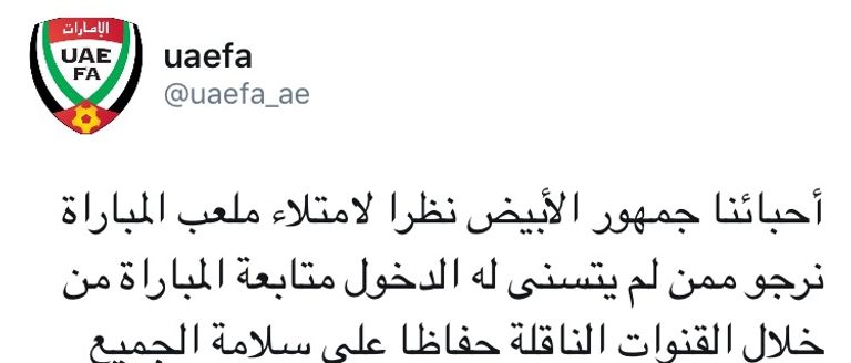 وجه الاتحاد الإماراتي لكرة القدم تعليمات إلى الجماهير الإماراتية الراغبة في حضور مباراة منتخبها الأول أمام نظيره الاسترالي في تصفيات المونديال، بأن يتابعوا المواجهة من خلال القنوات الناقلة في ظل امتلاء السعة الرسمية لاستاد محمد بن زايد في أبوظبي.
