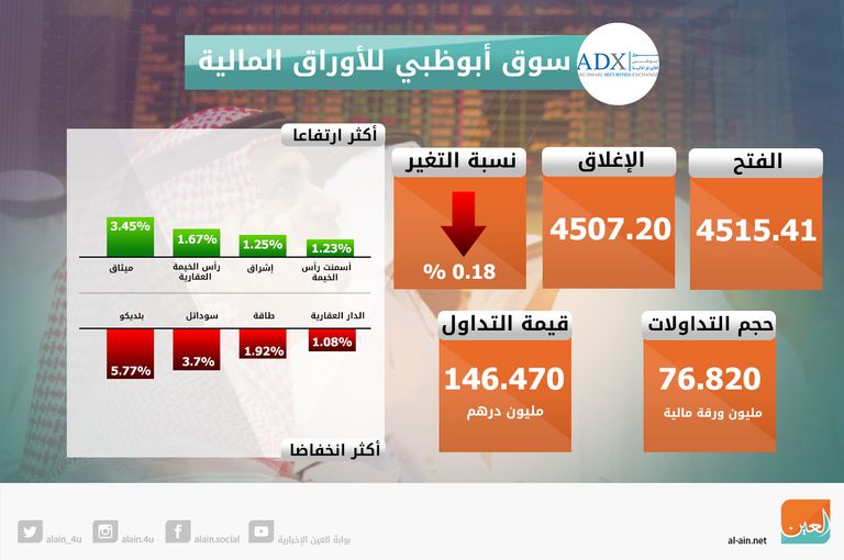 وتراجع المؤشر العام لسوق "أبوظبي" المالي 0.18% ليغلق عند 4507.20 نقطة، بعد التداول على 76.820 مليون ورقة مالية بإجمالي قيمة تداولات 146.470 مليون درهم تم تنفيذها خلال 1.190 ألف صفقة.