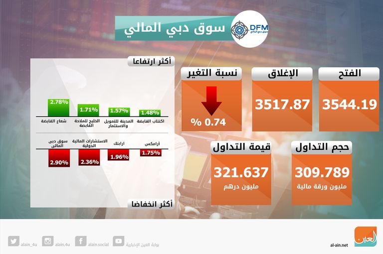 أنهى مؤشرات سوقي الإمارات تعاملات جلسة، الأربعاء، باللون الأحمر، حيث هبط سوق دبي المالي فاقدًا 0.74% ليسجل 3517.87 نقطة، بعد التداول على 309.789 مليون ورقة مالية حققت سيولة 321.637 مليون درهم تم تنفيذها خلال 3.294 ألف صفقة.