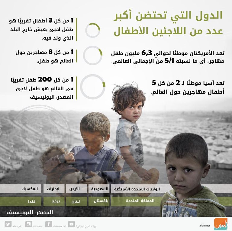 ويشكل أطفال دولتين فقط (سوريا وأفغانستان) أكثر من نصف عدد الأطفال اللاجئين في العالم، ويستعرض الإنفوجراف التالي أبرز الحقائق والأرقام التي كشفها تقرير اليونيسيف.