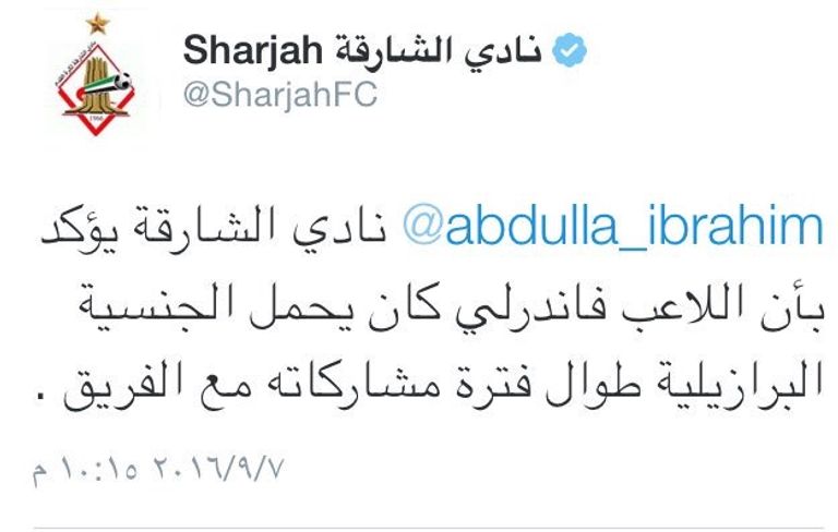 وأكد الشارقة في تغريدته أن فاندرلي كان يحمل الجنسية البرازيلية حينما كان يتواجد ضمن صفوف الفريق.