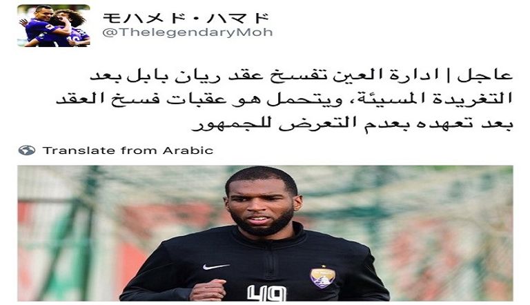 تكهن مغردون عبر موقع التواصل الاجتماعي "تويتر" بالأسباب الحقيقية التي أدت إلى فسح نادي العين الإماراتي عقد اللاعب الهولندي ريان بابل، حيث أشاروا إلى وجود تغريدة مستفزة تقف وراء هذا الأمر.