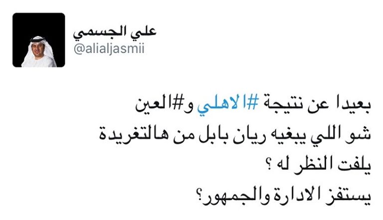 فيما قال علي الجسمي: "بعيدا عن نتيجة الأهلي والعين شو اللي يبغيه ريان بابل من هالتغريدة يلفت النظر له؟.. يستفز الإدارة والجمهور؟".