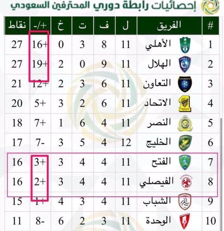 واستشهد أحد المغردين الهلاليين بموقف الفتح والفيصلي؛ حيث يحتل الفتح المركز السابع بـ 16 نقطة ويتفوق بفارق الأهداف عن الفيصلي صاحب المركز الثامن وله نفس الرصيد، على الرغم من أنهما لم يتقابلا وجها لوجه، وهو ما يخالف حالة الهلال والأهلي اللذين تواجها وفاز الأخير.