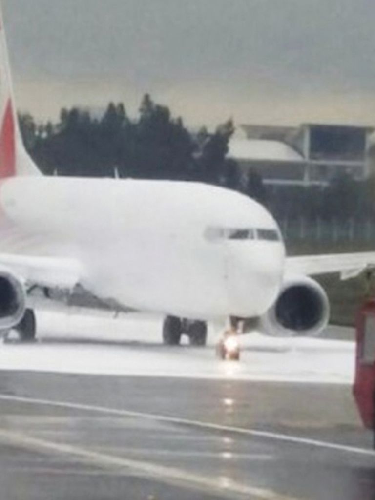 أغرق رجال إطفاء طائرة سليمة تستعد للإقلاع بالرغوة الخاصة بإطفاء الحرائق في مطار فوجيان شانجيل الدولي في فوجيان عاصمة مقاطعة شرق الصين.
