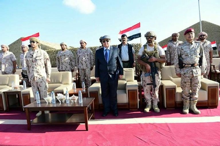 الرئيس اليمني عبد ربه منصور هادي، وقائد القوات الإماراتية العميد ركن ناصر مشبب العتيبي، يحضران حفل تخرج دفعة جديدة من عناصر المقاومة.