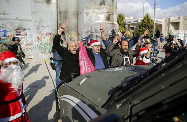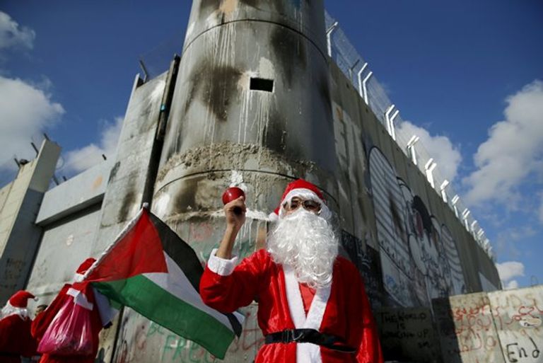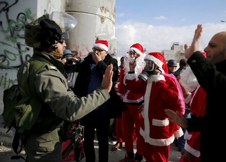 بالصور .. "بابا نويل" يشتبك مع الاحتلال الإسرائيلي في مهد المسيح