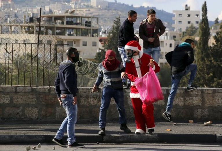 عشرات الفلسطينيين بزي بابا نويل اشتبكوا مع قوات الاحتلال في مدينة بيت لحم مسقط رأس السيد المسيح.