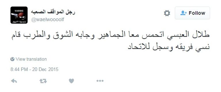 وقال مغرد آخر لقب نفسه بـ "رجل المواقف الصعبة: "طلال العبسي اتحمس مع الجماهير وجابه الشوق والطرب قام نسي فريقه وسجل للاتحاد".