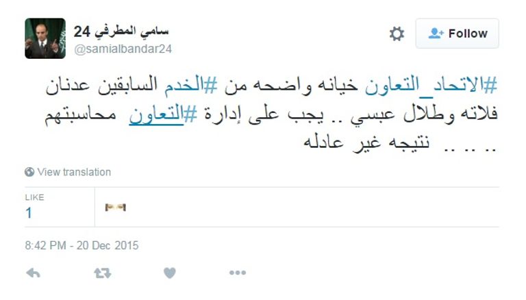 كما عبر عدد من مشجعي التعاون عن غضبهم من خطأ "العبسي" والذي تسبب في تأخر فريقهم بهدفين، وقال مغرد يدعى سامي المطرفي: "خيانة واضحة من الخدم السابقين عدنان فلاته وطلال عبسي.. يجب على إدارة التعاون محاسبتهم.. نتيجة غير عادلة".