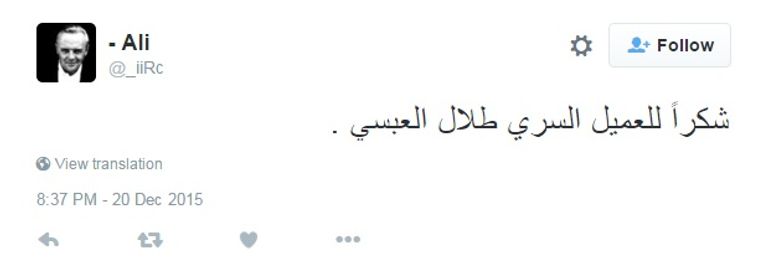 وأضاف مغرد يدعى علي: "شكرًا للعميل السري طلال العبسي".