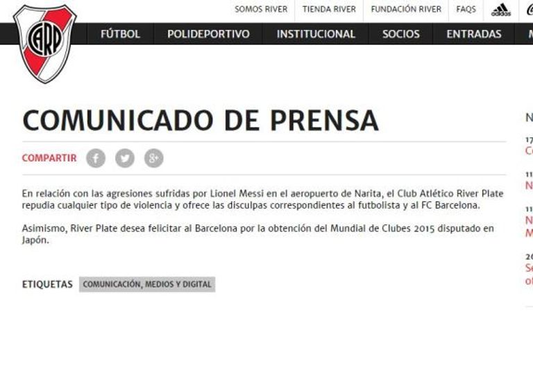 تقدَّم نادي ريفر بليت الأرجنتيني باعتذار رسمي لنجم برشلونة ليونيل ميسي، بعد الإهانة التي تعرَّض لها اللاعب قبل مغادرته اليابان مع بعثة النادي، من قِبَل بعض مشجعي ريفر، وقيام أحدهم بالبصق عليه.