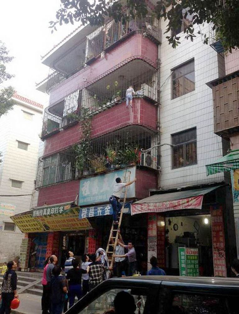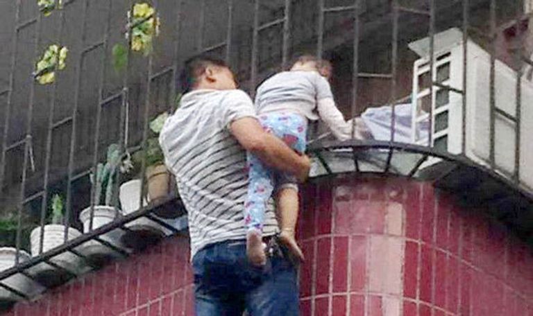 واستيقظ الطفل في صباح أحد الأيام ليجد البيت فارغًا، فقام بفتح نافذة شرفة الشقة التي تقع في الطابق الثالث جنوب الصين ليبحث عن والديه، لكنه فقد توازنه فانزلق وشارف على السقوط، إلا أن رأسه علق بين القضبان المعدنية للشرفة في وضع خطير.