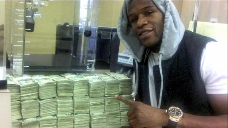 ونشر مايويذر صورة على حسابه، ظهر فيها وهو يستلقي بلا مبالاة فوق كومة ضخمة من الأموال، واضعًا سماعات في أذنيه، بينما يقوم عدد من الأشخاص بمحاولة جمع بعض الأموال.