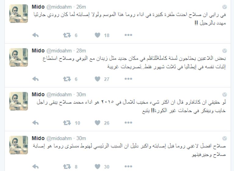 وقال "ميدو" في تغريدات له عبر حسابه الشخصي على موقع التواصل الاجتماعي "تويتر": "صلاح أفضل لاعبي روما قبل إصابته، وأكبر دليل أن السبب الرئيسي لهبوط مستوى روما هو إصابة صلاح وجيرفينهو".
