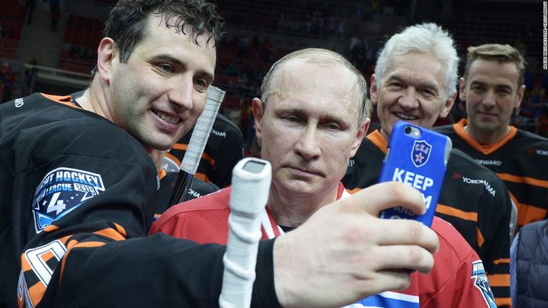 - الرئيس الروسي فلاديمير بوتين ينظر إلى هاتف نائب رئيس نادي "سانت بطرسبرغ" للهوكي، بعد لعب مباراة حادة شارك فيها عدد من المسؤولين الروس في مايو.