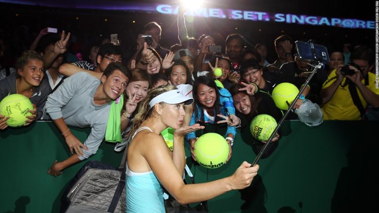 - لاعبة التنس العالمية ماريا شارابوفا تلتقط صورة بـ"عصا السيلفي"، بعد فوزها بمباراة في سنغافورا، في أكتوبر.