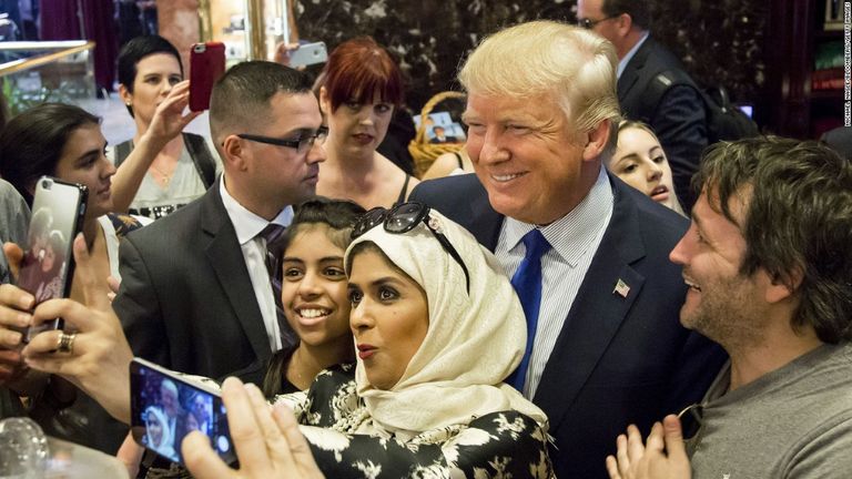 - المرشح الجمهوري الأبرز للرئاسة الأمريكية دونالد ترامب يقف بينما تلتقط فتاة مسلمة سيلفي معه، بعد حوار تليفزيوني له في نيويورك في أغسطس، وقبل تصريحاته المعادية للمسلمين حول العالم.