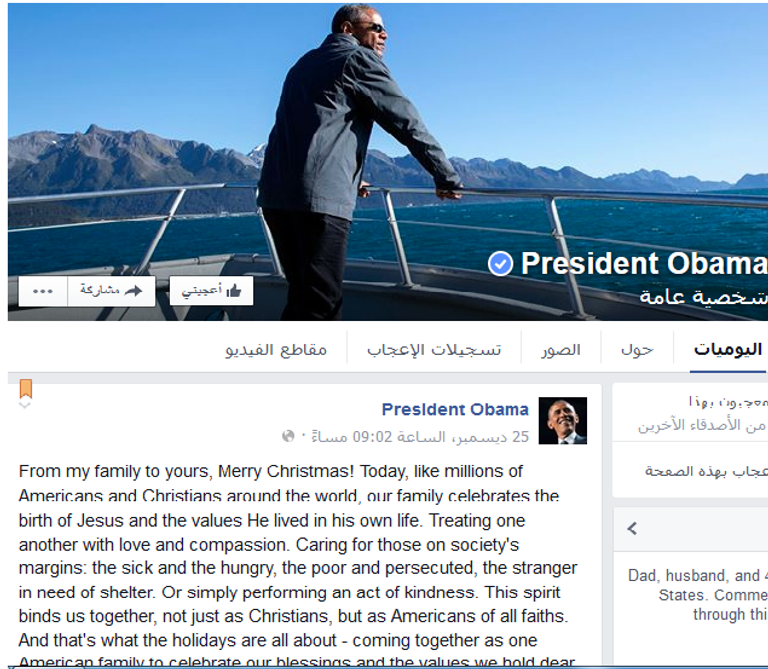 كان أوباما قد قال في رسالته: "من عائلتي لكم جميعًا، عيد ميلاد سعيد اليوم، مثل الملايين من الأمريكيين والمسيحيين في جميع أنحاء العالم، عائلتنا تحتفل بميلاد يسوع وتحْيي قيمه التي نادى بها من السلام والمحبة ورعاية المرضى والجوعى والفقراء والمضطهدين، ومَن في حاجة إلى مأوى. هذه الروح يجب أن تربطنا معًا، ليس فقط المسيحيون، ولكن الأمريكيون من جميع الأديان".