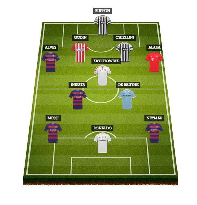 ونال لاعبو بلاوجرانا نصيب الأسد من التشكيلة بعدما تألقوا بشدة خلال العام، حيث قادوا فريقهم للفوز بخماسية ألقاب: الليغا، كأس الملك، دوري الأبطال، السوبر الأوروبي، كأس العالم للأندية.