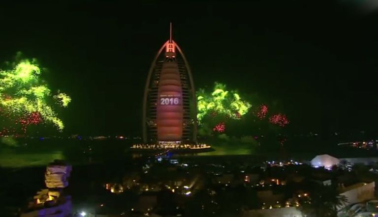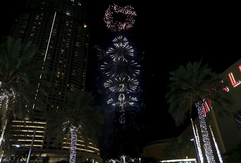 أضاءت الألعاب النارية الضخمة سماء إمارة دبي منتصف آخر ليلة من عام 2015، ليخطف برج خليفة -أبرز معالمها- الأضواء معلنًا انطلاق عام 2016.