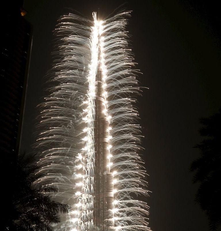 وتنظم دبي سنويًّا أحد أروع استعراضات الألعاب النارية في العالم من برج خليفة الذي يضم 160 طابقًا بارتفاع نحو 830 مترًا وافتتح في 2010.