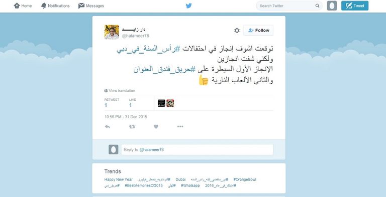 وقال مستخدم باسم "دار زايد" على صفحته على تويتر: توقعت أشوف إنجاز في احتفالات #رأس_السنة_في_دبي.. ولكني شفت إنجازين؛ الإنجاز الأول السيطرة على #حريق_فندق_العنوان والثاني الألعاب النارية.