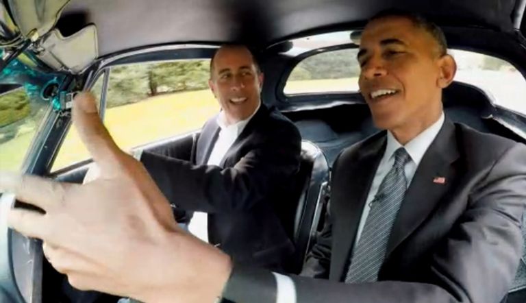 في أحدث حلقة من حلقات برنامج (كوميديانز إن كارز جتينج كوفي) جلس الرئيس الأمريكي باراك أوباما إلى جوار الممثل الكوميدي والإعلامي جيري ساينفيلد داخل سيارة من مقعدين انطلق بها ساينفيلد.