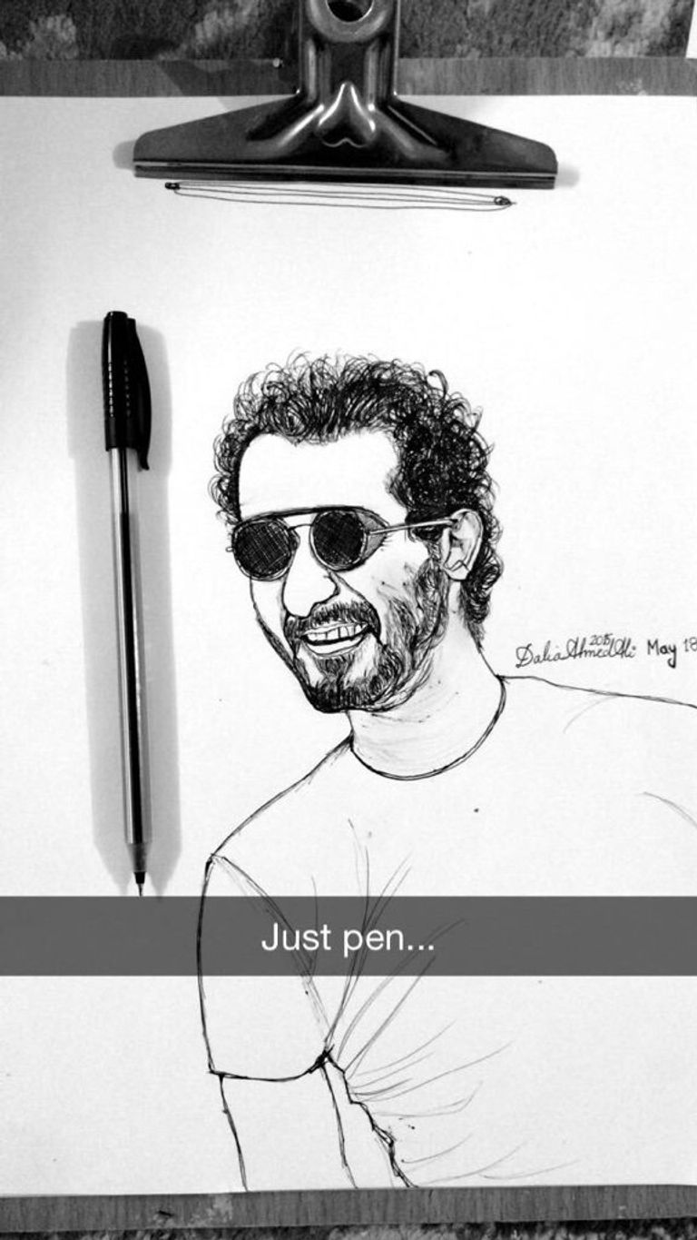 ثم نشرت داليا، على موقع "تويتر"، صورة رسمتها بقلم حبر أسود لحلمي وهو بنظارة شمسية، دون استخدام أقلام رسم خاصة، وعبّر حلمي عن إعجابه الشديد بالرسمة، موجها شكره لداليا.