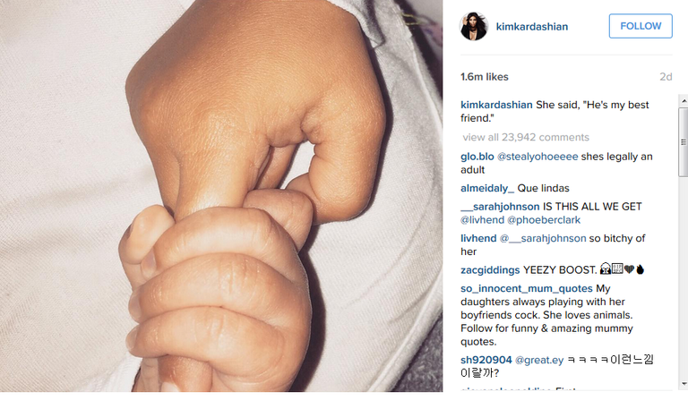 واكتفت كاردشيان بعد ولادة مولودها الجديد سانت ويست قبل أيام، بصورة تظهر فيها يد المولود الجديد، وهو يمسك بيد شقيقته نورث ويست دون الكشف عن ملامحه حتى الآن.
