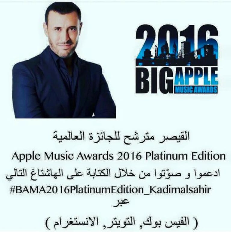 وتم ترشيح الفنان كاظم الساهر لنيل جائزة أفضل فنان في الشرق الأوسط ضمن جوائز "Big Apple Music Awards Foundation" وتم نشر أغنية الساهر الجديدة التي أطلقها مؤخرًا باللغة الإنجليزية "in love" عبر الصفحة الرسمية للمسابقة عبر "فيسبوك" ودعوة محبي الساهر للتصويت له عبر هشتاق: #BAMA2016PlatinumEdition_KadimAlSahir