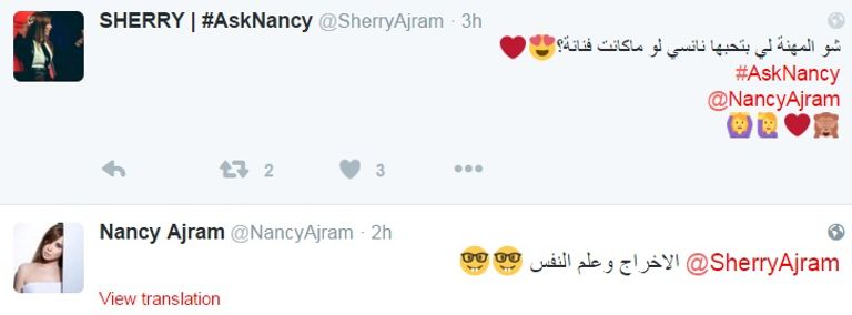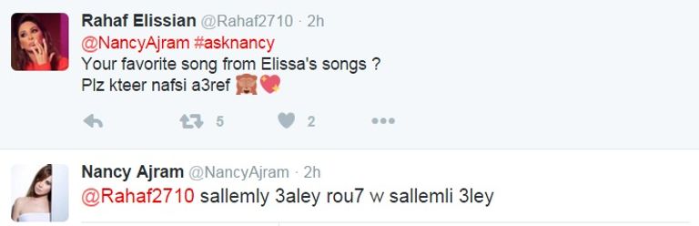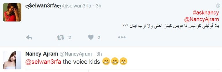جاء ذلك خلال حوار مع معجبيها على موقع "تويتر"، حيث استقبلت النجمة اللبنانية عشرات الأسئلة من معجبيها في جلسة استجواب جماهيرية، استمرت لمدة ساعة واحدة عبر هاشتاق "AskNancy".