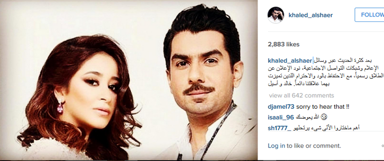 ونشر الشاعر على حسابيه بموقع تويتر وانستغرام صورة تجمعه بأسيل، وقال: "بعد كثرة الحديث عبر وسائل الإعلام وشبكات التواصل الاجتماعية، نود الإعلان عن الطلاق رسميًّا، مع الاحتفاظ بالود والاحترام اللذين تميزت بهما علاقتنا دائماً... خالد و أسيل".