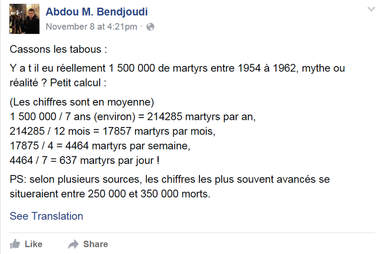 وطالب المعارض السياسي الجزائري محمد عبد الرزاق بنجودي، المقيم في فرنسا، والمعروف باسم "عبدو بنجودي"، على صفحته بموقع التواصل الاجتماعي "فيس بوك"، بـ"كسر الطابو المقترن بعدد شهداء الثورة الجزائريّة".