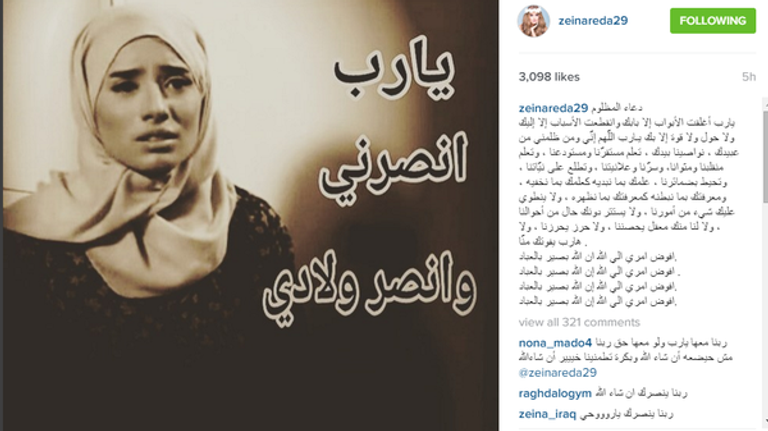 وظهرت زينة في الصورة وهي ترتدي الحجاب، وعلّقت عليها بدعاء المظلوم الذي قامت بكتابته كاملًا على الصورة، واختتمته قائلة: "وأفوض أمري إلى الله إن الله بصير بالعباد"، والتي قامت بتكرارها 4 مرات.