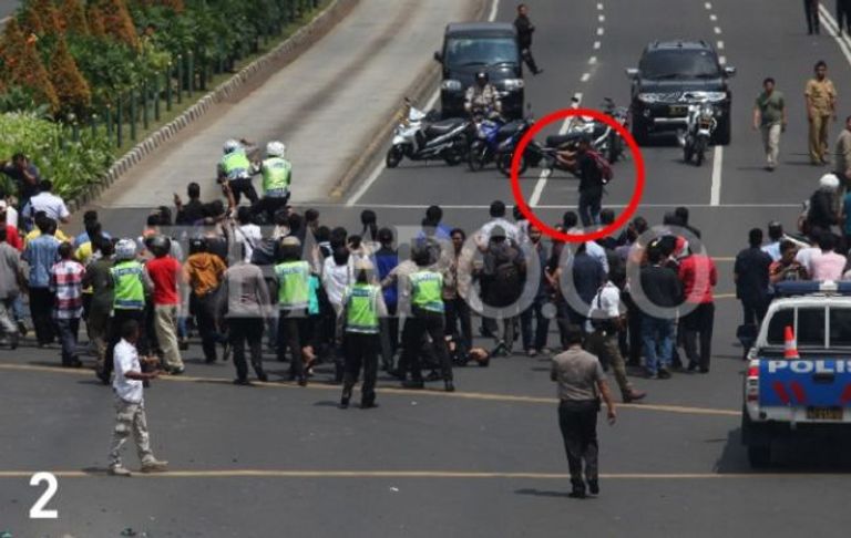 1- بعد دقائق قليلة من الانفجار أمام مركز للشرطة مقابل مركز Sarinah التجاري، اقترب اثنان من المسلحين اللذان زعما بأنهما من ضمن الجماهير المتجمعة حول الحادث.