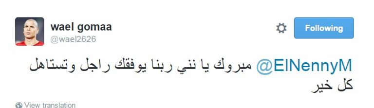 وكتب أيضا وائل جمعة مدافع الأهلي ومنتخب مصر السابق عبر حسابه على "تويتر": "مبورك يا نني ربنا يوفقك راجل وتستاهل كل خير".