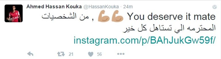 أما لاعب هال سيتي ومنتخب مصر أحمد المحمدي فقال في تغريدة باللغة الإنجليزية مفادها: "كل التوفيق لك يا أخي .. النني".