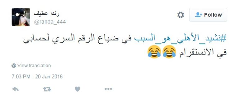 وقالت مغردة تدعى رندا عطيف: "#نشيد-الاهلي-هو-السبب في ضياع الرقم السري لحسابي في انستقرام".