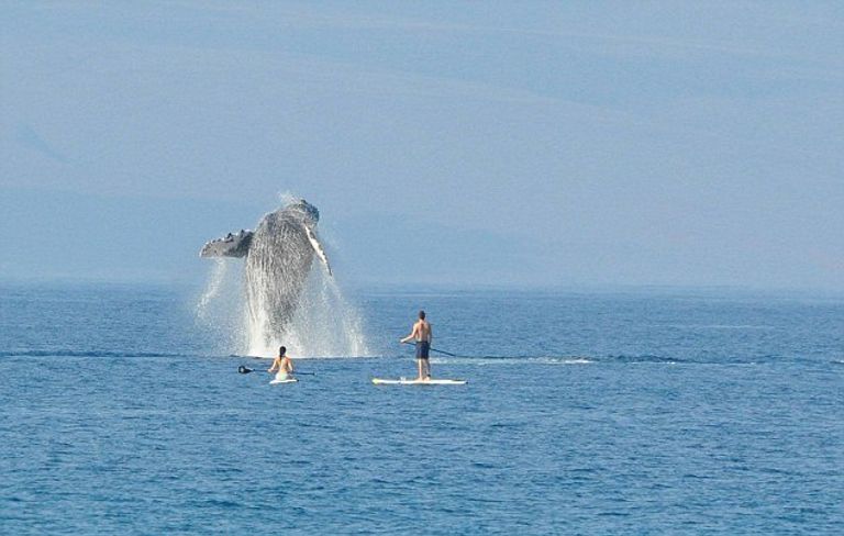 فوجئ زوجان يمارسان رياضة التجديف في الساحل الغربي لماوي، عندما ظهر حوتان ضخمان للاستمتاع بذلك النهار ولإلقاء التحية على الزوجين.