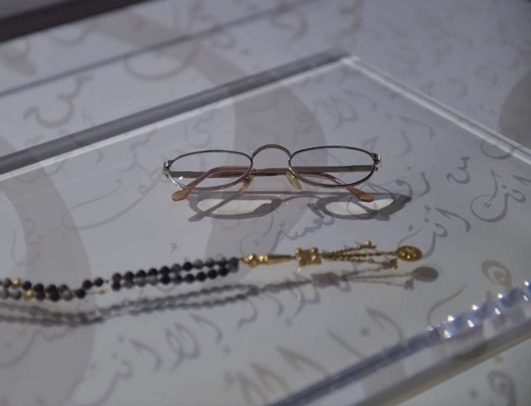 ومن بين المقتنيات الأخرى التي شملها المعرض، كتاب الله الكريم ومواقيت الصلاة ومذكرة للادعية والأذكار اليومية وسجادة للصلاة ومسبحة ونظارة للقراءة وعصا كان يتكئ عليها.