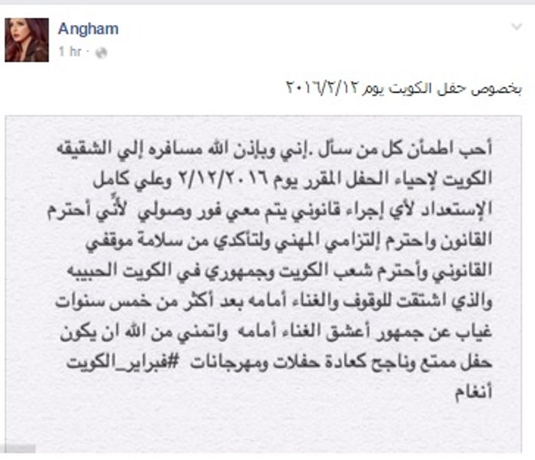أنغام أكدت احترامها القانون والتزامها المهني، موضحة أنها ستحضر الحفل وتواجه شعب الكويت، بعد غياب 5 سنوات