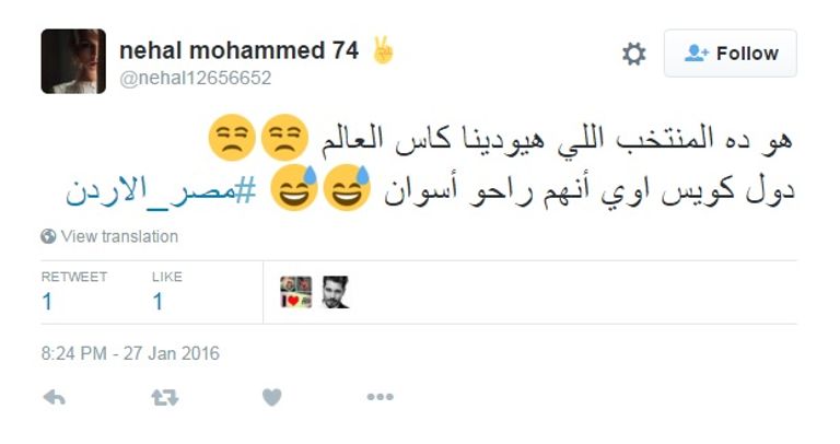 سخر مستخدمو موقع التواصل الاجتماعي "تويتر" في مصر من خسارة المنتخب المصري أمام نظيره الأردني بهدف دون رد في المباراة الودية التي جمعت المنتخبين على ملعب أسوان.
