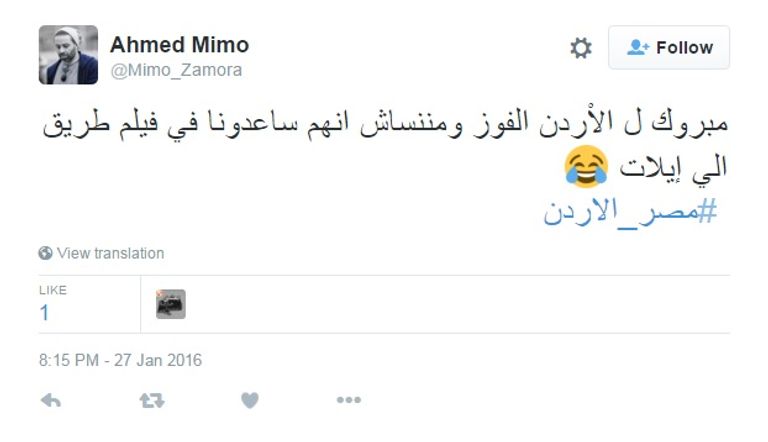 وأضاف مغرد لقب نفسه بـ"أحمد ميمو": "مبروك للأردن الفوز وماننساش إنهم ساعدونا في فيلم الطريق إلى إيلات".